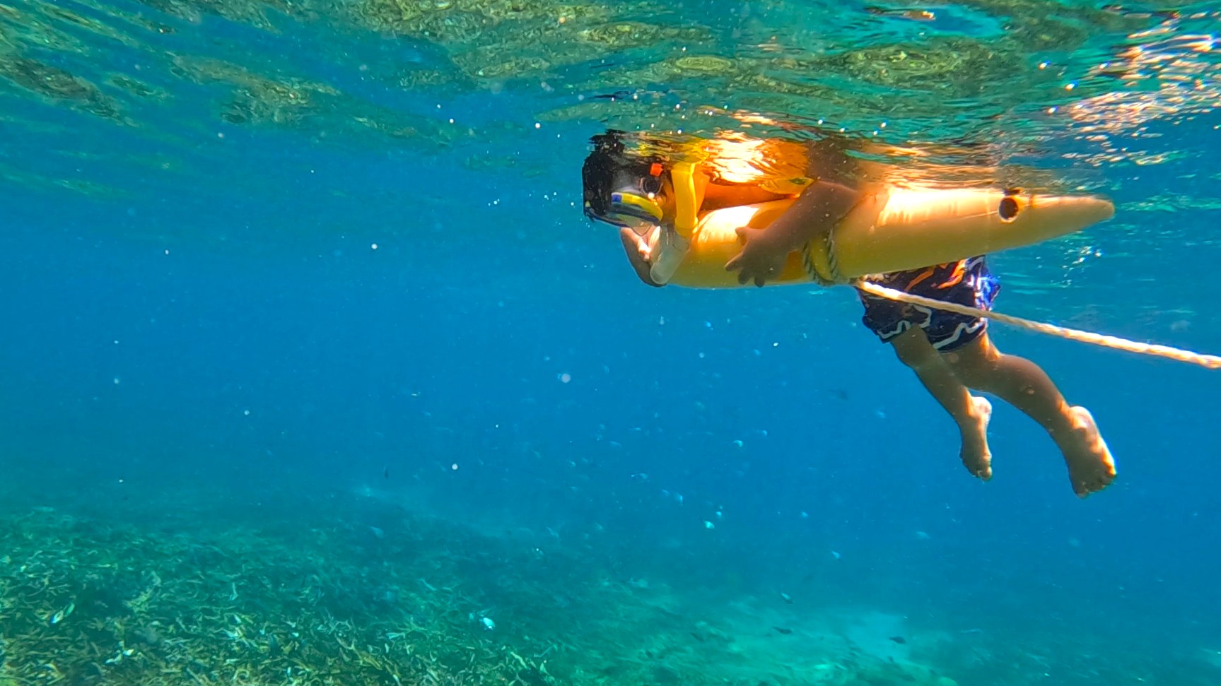 ライフジャケットを着けて浮き輪に掴まれば泳ぐ必要はありません。泳げなくても全く問題ないんです。泳ぐ事よりもシュノーケリングマスクを正しく使う事が重要です。