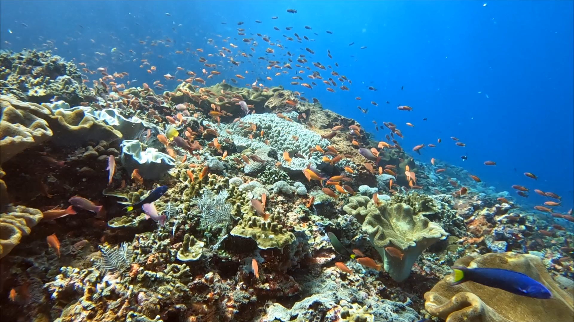 その棚の上を流されながらシュノーケリングするんですが、とにかくここは魚の種類が豊富でキンギョハナダイの群れと、カスミチョウチョウの群れがわんさか泳いでるのが見れますし、運が良ければクサヤモロの群れも入ってきてリアル竜宮城のような大騒ぎになります。